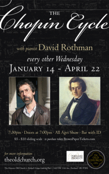 David Rothman presently lives in Portland, Oregon and is a frequent guest artist on The Old Church's Sack Lunch Concert Series. Performing the complete works of Frédéric Chopin has been one of his goals and it is quite a monumental task. In the course of this series, David will perform 51 Mazurkas, 24 Studies, 24 Preludes, 19 Nocturnes, 4 Ballades, 4 Scherzos, 4 Impromptus, 7 Polonaises, 14 Waltzes, one Berceuse, one Fantaisie, and one Barcarole.