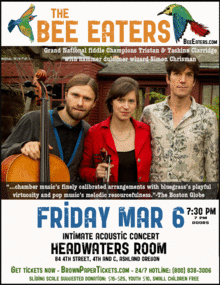 Since their formation in 2008, The Bee Eaters have been on a trajectory of growth, both personal and musical. Recent tours have taken them from Vermont to Hawaii to England and everywhere in between, collaborating with performers such as bluegrass legend Laurie Lewis, Appalachian music master Bruce Molsky, rising-star songstress Aoife O'Donovan (of Crooked Still renown), soulful singer/guitarist Scott Law and writer/ballad singer Jefferson Hamer. Festival highlights include Wintergrass, and the 40th annual Indiana Fiddlers Gathering.