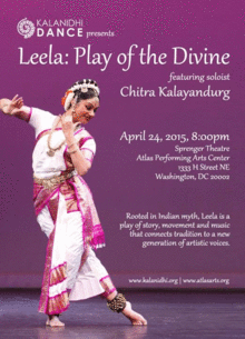 Leela: Play of the Divine is a solo performance by Chitra Kalyandurg. Accompanied by an ensemble of musicians, and featuring new choreography, Leela is a joyful play of rhythm, music and movement, connecting tradition to a new generation of artistic voices. Chitra Kayandurg is a performer and choreographer based in Maryland. Trained under Kalanidhi Dance Artistic Director Anuradha Nehru, Chitra performs as a solo artist and with Kalanidhi Dance extensively throughout the DC area. Her artistic inspiration comes from sharing Kuchipudi through a multi-disciplinary, collaborative lens; creating ensemble work that helps connect diverse audiences to the themes present in classical Indian dance.