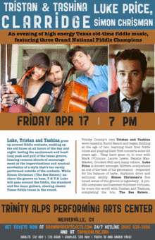 Luke Price and Tristan & Tashina Clarridge grew up playing Texas fiddle in contests, soaking up the old tunes at all hours of the day and night: feeling the excitement and headlong push and pull of the texas groove, hearing raucous shouts of approval and encouragement at the improvisations and musical acrobatics of a style that is seldom performed outside of the contests. With a combined seven years worth of Grand National Fiddle Championships between them and dozens of other accolades, they would appear on paper to be perfect ambassadors of the style but it isn't the contest wins that make them champions of Texas fiddling, it is the fact that they stay up all night and jam, instead of practicing for their rounds the next day, reveling in the thing that is the very life of the style: the energy and joy created by simply sharing these tunes with one another. This tour aims to bring that energy, the excitement and spontaneity of a good Texas fiddle jam, to intimate venues around the west. While Simon Chrisman (of The Bee Eaters) anchors the groove on bass, T & T & Luke will pass around the fiddle, the standard and the tenor guitars,sharing classic Texas fiddle tunes in the round.