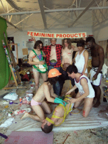 Because the video contains sexually explicit content, the term 'porn' is relevant and the artists have an interest in exploring the trappings of the term itself. Sex, sexuality and the complexities of gendered bodies are inherently political. Queer sex and feminist agency is a shared acknowledgment of reciprocal penetration. This project is a small archive of an intergenerational community built on collaboration, friendship, sex and art. The work attempts to explore a consideration of feminist fashion, sexual aesthetics and an expansive view of what is defined as 'sex'. Burns and Steiner worked with artists and performers who created infinitely complex gender and performance roles that are both real and fantastical, set to a soundtrack of music and original compositions by artists culled from the worldwide sisterhood. The video seeks to expose and reformulate paradigms that are typical of porn typologies, intentionally exploiting tropes for their comical value, critical consideration and historical homage. Using the gallery to exer/exorcise the mystical and discreet lost spaces of homosocial configuration, the artists have created a reason and a space to reflect on the cultural realness of homo-grown lesbian sexuality. The work aims to be a hedonistic and distinctly political adventure.