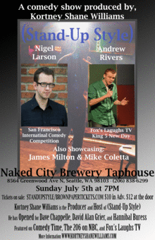 Andrew Rivers is a national touring comedian that started his career in the Northwest. He's appeared twice on Fox's Laughs TV and was recently selected as a contestant on Last Comic Standing. Nigel Larson is a staple of the Seattle comedy scene. He's been a Semi-Finalist in both the San Francisco and Seattle International Comedy Competitions.