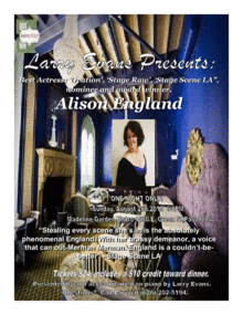 You have never scene a singer and actress like Alison England. A true artist, she connects with the audience from the first note of her performance. She is totally immersed in the world of the song, so you can be too. She has been the lead in "Hello Dolly", "Gypsy" and more recently Sweeney Todd. And in all of her roles she knocked people over and received rave reviews. This is a farewell performance, she is moving to New York, late August so you won't want to miss this one! Ticket for $24 includes a $10 credit towards dinner. Cabaret at Madeline Garden Restaurant, 1030 E. Green Street from 6 to 8 pm. please be on time there is a full show planned.Limited seating, tickets must be bought in advance. Questions? You can call Larry at 626-202-5194. Larry Evans will accompany on piano, and you also get to will enjoy the food at the beautiful Madeline Garden Restaurant. The show will take place in one of the most elegant rooms in Pasadena.