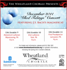 The 2011 "Glad Tidings" Holiday Concerts feature J.S. Bach's "Magnificat", seasonal compositions by contemporary American, Canadian and British composers such as Mack Wilberg, Z.R. Stroope, Eleanor Daley, Stephen Hatfield, Peter Philips and John Rutter, a selection of traditional carols and a commissioned work, "Veni Emmanuel" by Douglas Weaver. The concerts will be presented in three separate venues in Berks, York and Lancaster counties throughout the weekend of December 9-11.