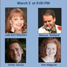 Featured performers are: March 3 at 7PM: Arnaldo! Drag chanteuse and Cheryl Serio with musical director, Victor Janusz March 3 at 9PM: Judy Ann Moulton, Kim Maguire and Marcus Wolland with musical director, Victor Janusz March 10 at 7PM: Ter Gallagher and Jerome Elliott with musical director, Daryl Spadaccini March 10 at 9PM: Jeannette d'Armand and Arnaldo Inocentes with musical director, Daryl Spadaccini