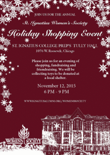 Start you holiday Shopping early. The S. Ignatius College Prep Women's Society annual Holiday Event will be held Thursday November 12, 2015 form 6:00 PM to 9:00 PM. Vendor's tables will be set up in the school's Tully Dining Hall, 1076 West Roosevelt Road, Chicago. All proceeds from this sale will be used to help finance the Women's Society philanthropic initiative. Recent appeals have funded such projects as technology in the classroom and the installation of new stained glass windows in the Cuneo Chapel. There is something for everyone we will have vendors, cash bar, food and fabulous raffle prizes during the evening. Spread the word to your friends and family about a night of shopping, fundraising and friendraising.