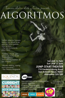 Tamara Adira Arte y Pasion presents ALGORITMOS JAN 16-17 JUMP-START THEATER 710 Fredericksburg Road San Antonio Texas Flamenco Dance: Melissa Cruz Tamara Adira Modern Dance: Stephan Gaeth Rochelle Banuet Cante: Champion Chayito Opera: Rachel M Latremore Guitar: Ricardo Diaz Violin: Darian Thomas Live Painting: Jd Morera