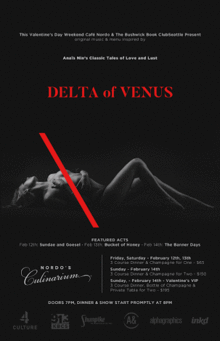 Bushwick's musicians and Café Nordo's Chef Erin Brindley create an evening of music and dining inspired by early 20th century smut. The result is a Valentine's Day celebration of literature, music, sex,and hedonism for couples and singles alike.