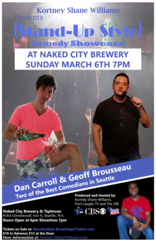 The show features international touring Stand-Up comedians, and is hosted Kortney Shane Williams, who has opened for David Alan Grier, Dave Chappelle, and regularly opens for Hannibal Buress. He's appeared on Comedy Time, Fox's Laugh TV, and The 206 on NBC. This month's show will be held Sunday March 6th at 7 PM. It will feature Geoff Brousseau and Dan Carroll. Both are headliners in the own right, so it's a real treat to see them share the stage for this special event.