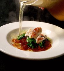 BOLSHEVIK BLINIS 3 Buckwheat Blinis: Orange and Saffron Yogurt with Beet Caviar, Dill Yogurt and Smoked Salmon Meringue, and Caraway Yogurt with House Made Sauerkraut. (We are proudly serving Ellenos Greek Yogurt from Georgetown) *Gluten Free Buckwheat Blinis available, ask your stewardess CHINESE TEA NOODLES House Made Chinese Black Tea Glass Noodles in Dungeness Crab & Pork Consommé served with Bok Choy, Scallion Oil, & Hoisin Sauce