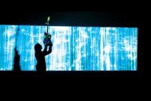 Sight Unseen consists of a guitar suspended from a rope in the middle of the performance space. Wireless equipment is used so the guitar can move around the space un-tethered from the amplifier. Projection screens are placed site-specific in the space, sometimes two screens facing each other, or two screens side by side on one plane of the room, or three screens with one used as an entry way. There is no fixed stage but rather the bare floor with no separation between audience and performer. The overall intention is to create an environment where the performers and the audience are engaged in an immersive sight and sound experience that is more circular than linear, allowing for personal interpretation rather than fixed exposition.