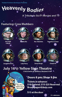This will be an immersive show. Join us aboard the U.S.S. Yellow Sign as we journey through space. Your in-flight entertainment will feature acts based on Sci-Fi movies and TV shows from popular favorites to cult classics. We'll do our best to avoid meteor showers, but we can't promise you that.