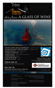 We Flamenco Fest, in conjunction with Brick at Blue Star with support by the Artist Foundation of San Antonio and the Department of Cultural and Creative Development, presents Arte y Pasións A GLASS OF WINE. The performance, under the direction of Tamara Adira, is a series of lush vignettes that explores the meaning and significance of the experience surrounding drinking a glass of wine. The project will explore intimacy of a moment, escape, and frivolity of guilty pleasure in light of a world of alienation and violence. Arte y Pasion A GLASS OF WINE shows this Sep 29 and 30 at the Brick at Blue Star and then at outdoor performance space 329 North Main, San Antonio Texas.