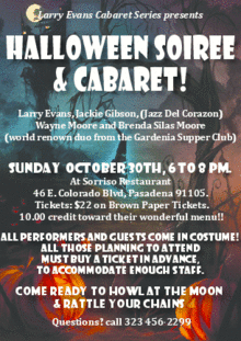 Two shows in one. First Larry Evans on piano, and Jackie Gibson, an accomplished and expressive singer. All singers will be in costume. The second show features the world renown duo Wayne and Brenda who will be sharing their annual Halloween show. This show has been met with an enthusiastic audiences for 30 years in Hollywood! Audience members can dress in costume if they like. $22 ticket includes a $10 dinner credit when you arrive.