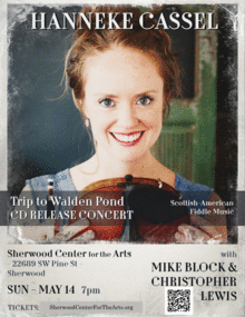 OREGON born Scottish Fiddle Champion Hanneke Cassel and her trio (Mike Block on cello and Christopher Lewis on guitar), will be in Sherwood at the Center for the Arts for her CD Release Trip to Walden Pond Mothers Day Community Concert. With opening act by CJ Neary, 11 year old National fiddle champion!