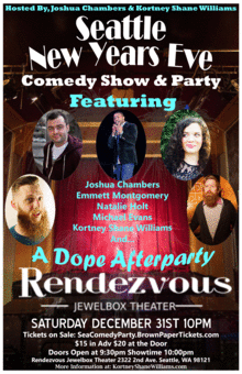 Kortney Shane Williams and Joshua Chambers, host a special New Years Eve Comedy Show Party in Seattle. Not only will there be a great lineup of international touring comedians, but there will be a New Years after show party included.