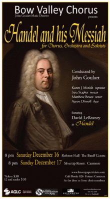 The innovative and exciting interpretation, entitled "Handel and his Messiah," will feature veteran Canadian stage and film actor, David LeReaney as Handel. Mr. Reaney will be joined by the Bow Valley Chorus, as well as soloists soprano Karen Minish, mezzo Sara Staples, tenor Matthew Bruce, bass Aaron Dimoff, with orchestral accompaniment.
