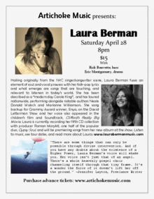 "There are some things that can only be possible through divine intervention. And if you have any doubts about the existence of a Higher Power, Laura Bermans voice will shake you. Her voice isnt just that of an angel. Theres a whole heavenly gospel choir channeling itself through that tiny frame.Its a wonder the force of it doesnt lift her off the ground..." - Jennifer Layton, Freelance Writer
