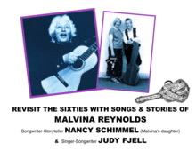Judy Fjell grew up in Montana listening to folk-protest music on the radio and was so inspired to sing the repertoire that she bought a garage sale guitar and taught herself to play. Nancy Schimmel, the daughter of Malvina Reynolds, experienced firsthand her mothers protest stories and songs in Berkeley, California. Nancy Schimmel truly knows the life of Malvina Reynolds better than anyone else alive today. When Judy and Nancy met at a Fjell concert in Oakland, California, in the mid-eighties, they began a conversation and collaboration which continues to the present. Each Malvina Reynolds concert is a one-time-only celebration of the life of this American songwriter, who collaborated regularly with Pete Seeger and whose songs are still performed forty years after her death. Malvinas song Little Boxes is currently known from the Weeds television series. It has also been seen on YouTube by 13 million viewers in Walk Off the Earths brilliant cardboard box set video. Kodak adapted Turn Around, Malvinas song about her daughter Nancy for its television ads in the sixties. A civil rights sit-in at San Francisco's Palace Hotel inspired Malvina to write It Isnt Nice, still a favorite at protest gatherings. Other well-known Malvina songs are What Have They Done to the Rain, Magic Penny, God Bless the Grass, and Morningtown Ride, which was a top hit in England for several weeks. Judy and Nancy will also perform several of the songs they have co-written in the spirit of Malvina.