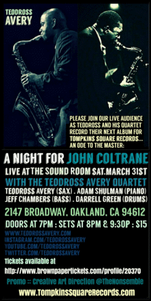 Featuring: The Teodross Avery Quartet Teodross Avery (saxophone) Adam Shulman (piano) Jeff Chambers (bass) Darrell Green (drums) _____________________