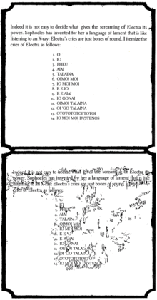 Elektras vocalizations pierce through language, revealing a shattered interior of multifaceted reflections constructed against habitual linguistic or vocal expression. In tragic convention, such habitual vocalization takes the shape of the often terse, patriarchal voice of the Greek philosopher -- a didactic, conceptual container in opposition to the expressive becoming of Elektras cries that riot against fixity. As a tragic character, Elektra is radical and alien for Sophocles and his audience -- an ever-present conviction that demonstrates how female shame has constructed a life-size funeral urn around her.