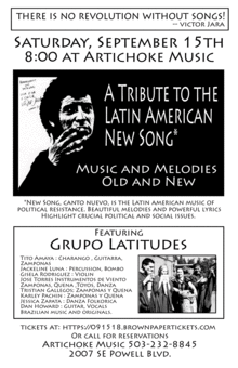 Tito Amaya and Grupo Latitudes honor the Latin American New Song and its influences throughout the Latin American continent. New Song, canto nuevo, is the Latin American music of political resistance. Beautiful melodies and powerful lyrics highlight crucial political and social issues.