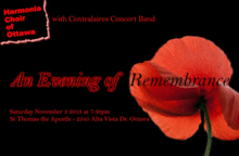 Harmonia Choir of Ottawa and Centralaires Concert Band present an evening of music for Remembrance Day. Featuring Ottawa composers Kirkland Adsett (In Flanders Fields) and Laura Hawley (Au champ d'honneur) and more, with opportunities for audience participation.