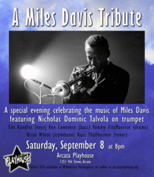 Trumpet player Nick Travola who has recently returned to the area after much international performing brings together local players Tim Randles (keyboard), Ken Lawrence (bass), Tommy Fitzmaurice (drums), Russ Thallheimer (sax) and James Zeller (trombone) for an evening of Miles Davis music. After selling out this show at the West Haven Community Center there were calls for more hence a special night at the Playhouse. Please join us. Tickets $10