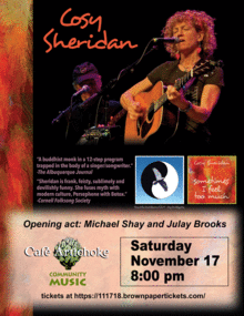 Songwriter and guitarist Cosy Sheridan has been called one of the eras finest and most thoughtful songwriters. Her CD, Pretty Bird, was listed in Sing Out Magazines Great CDs of 2014. Her concerts are full of energy and emotionality - and her songs are carefully crafted. Cosy writes intelligent and clever lyrics with stickable melodies, wrote Sing Out.