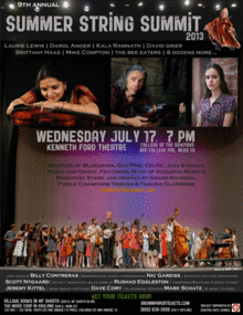 Mt Shasta, CA (June 12, 2013) Many of America's most influential and brilliant acoustic musicians will gather, Wednesday July 17, 2013, 7 p.m., at College of the Siskiyous' Kenneth Ford Theatre for the Summer String Summit 2013, produced by renowned acoustic musicians and educators Tristan and Tashina Clarridge and supported by the Siskiyou Arts Council.