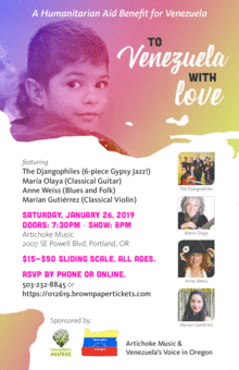 Featuring the Djangophiles, Maria Olaya (Classical guitar), Marian Gutiérrez, and Anne Weiss (blues and folk) and friends! Sponsored By Artichoke Music and Venezuela's Voice in Oregon