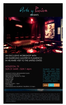 Arte y Pasion cordially invites you to an exclusive dance workshop with Flamenco Dancer and Artist in his second visit to the United States. This is a workshop with limited space and will not be publicized. Space is limited to this workshop. Please feel free to invite your colleagues via email or word of mouth, but we ask that you do not publish this on social media.