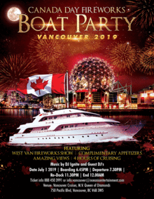 Vancouver Party Cruises Presents Canada Day Fireworks Boat Party 2019. Celebrate Canada Day and join the biggest party on Vancouvers Biggest Boat Cruise. Party like never before on our Floating Night Club and Enjoy West Vancouver Fireworks Show, Complimentary Appetizers, Amazing Views and much more!! We got some of the hottest DJz playing top 40, Hip Hop, Rap, Reggaeton, Throwbacks and Much More!!