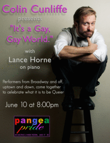 Performers from Broadway and off, uptown and down, come together to celebrate what it is to be Queer. Colin Cunliffe is joined by a fancy family of homos and their allies answering, through song, the question "What does the gay world mean to you?" Lance Horne on piano collaborates with some of the finest voices in the city to create an evening of community, entertainment and inspiration. Ticket sale proceeds from the evening go to Rainbow Railroad, a non government organization helping LGBTQI people as they seek safe haven from state-enabled violence, murder or persecution.