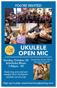 Calling all players and fans of the ukulele! Join us for an entire evening devoted to our love for our delightful instrument. Hosted by Avery Hill, Director of Song by Song™ (www.learnsongbysong.com), this Ukulele Open Mic will feature acts representing a variety of ukulele communities around the Portland metro area. Jam leaders from around town will direct the entire audience in a couple group songs, as well, so all are encouraged to bring their instrument(s)!