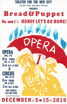 The Honey Let's Go Home Opera is a raucous fantasy on the perils and promises of 2-dimensionality in contemporary life, which takes cardboard as its muse and prime material. Featuring giant puppets and costumes made from cardboard and papier mache, painted in exuberant, expressionist style by Peter Schumann, Honey marshals music by Berg, Mozart, Messiaen, and Brahms as well as a chorus of local performers to praise cardboard's transformative capabilities. Cardboard is highlighted as a model in this political, economic and ecological moment so much in need of radical transformation.