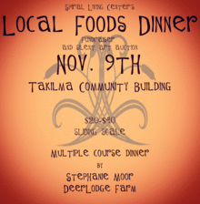 Let us prepare a delicious Local Foods Dinner for you Saturday, November 9th, at the Takilma Community Building, 9367 Takilma Road! Doors open at 5:30 p.m.