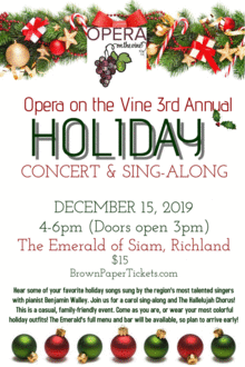 Ring in the season with Opera on the Vine's 3rd Annual HOLIDAY CONCERT & SING-ALONG Hear some of your favorite holiday songs sung by the region's most talented singers with pianist Benjamin Walley. Join us for a carol sing-along and The Hallelujah Chorus! Featured singers: (To be announced.) This is a casual, family-friendly event. Come as you are, or wear your most colorful holiday outfits! The Emerald's full menu and bar will be available, so plan to arrive early to get a table and order before the show.