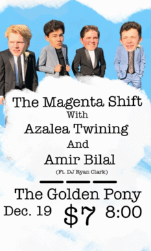 The Magenta Shift performing with fellow Harrisonburg High School acts Azalea Twining (singer/songwriter) and Amir Bilal (hip hop ft. DJ Ryan Clark). Tickets are $7 All ages.