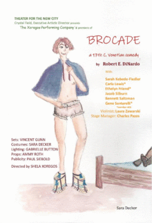 Theater for the New City (Crystal Field, Producing Artistic Director) presents The Xoregos Performing Companys Brocade, an intriguing world premiere comedy set in 17th Century Venice written by Robert E. DiNardo. Shela Xoregos directs a cast of six, including Ethelyn Friend*, Sarah Kebede-Fiedler, Carla Lewis*, Bennett Saltzman, Gene Santarelli*, and Jacob Silburn with violin excerpts performed by Laura Zawarski. Original music has been composed by Barbara Rottman.