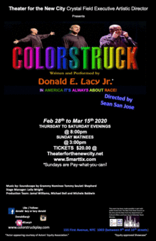 From February 27 to March 15, Theater for the New City (TNC) will present comedian/actor/broadcaster Donald E. Lacy Jr. updating his one man show, "ColorStruck," a bittersweet examination of how cultural assumptions drive American society. Since national politics provide a never-ending supply of new material, the piece is continually reshaped. The velocity of change since TNC presented the show's New York debut last year (Feb-March, 2019) has inspired Lacy to initiate a new version that reflects pressing current events.