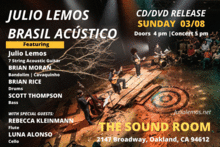 Julio Lemos Brasil Acoustico CD release event Julio Lemos: 7 string guitar Brian Moran: bandolim/cavaquinho Scott Thompson: bass Brian Rice: drums Plus special guests