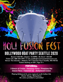 Seattle Indian Boat Parties and Oceanic Entertainment brings you Holi Fest Bollywood Boat Party Seattle 2020!! Celebrate the Holi festival in style! Party on a boat and see your city like never before!! Dance to all your favorite Bollywood and other regional hits all night long!!