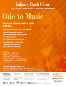 Calgary Bach Society joyfully returns to live performance with a 60 minute concert featuring the choir, 4 stellar soloists and a small instrumental ensemble J.S. Bach - Selected Choruses from Cantata BWV 213 Aichinger - Regina coeli Pitoni - Cantate Domino Pachelbel - Magnificat in D Purcell - Welcome to all the pleasures (Ode for St. Cecilia's Day, 1683)