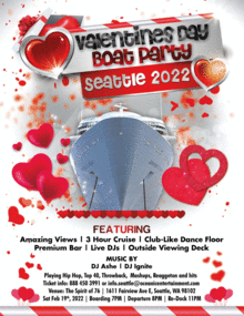 Largest Valentines Party in Seattle 3 hours of cruising around Seattle, WA Floating Night Club Club-Like Dance Floor Premium Fully Licensed Bar Talented DJz Professional photographer Free street parking Date: Sat, Feb 19th, 2022