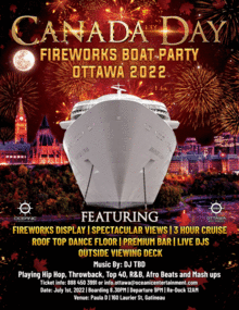 Featuring: - Spectacular Views Ottawas landscape - Fireworks Display - Club-like Dance Floor with Roof Top - Luxury Boat - Fully Licensed Premium Bar - 3 hours of cruising around Harbor - 2 Level Yacht - Talented Live DJ - Professional photographer - Spacious Outside Viewing Deck - Smoking Permitted on the Outer Deck
