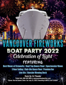 Featuring: -Best View of Fireworks on a BOAT -Amazing Views of your city Vancouver -Club-like Dance Floor - Roof Top -Fully Licensed Premium Bar -3 hours of cruising around Harbor -Talented Live DJ -Professional photographer -Outside Viewing Deck -Smoking Permitted on the outer Deck