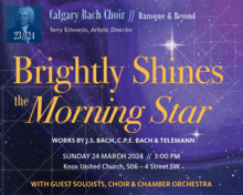 The sun, moon, stars, - all spheres of light - are harbingers of hope. You'll hear German language versions of J.S. Bach's brilliant setting of the familiar German chorale, How Brightly Shines the Morning Star in his Cantata #1, Telemann's vibrant Psalm 96 - Sing to the Lord a New Song and CPW Bach's spritely Symphony in F Major.