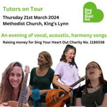 Tour Dates March 2024 Tuesday 12th Unitarian Church, Great Yarmouth Wednesday 13th Lincoln Hall, Hingham Tuesday 19th Lighthouse, Sheringham Thursday 21st Methodist Church, Kings Lynn Saturday 23rd St Catherines Hall, Norwich Doors open: 6:30pm Concert 7 - 9pm Tickets: Pay what you can £5 - £15 Book in advance at the Sing Your Heart Out sessions or at Brown Paper tickets.