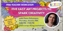 There are countless ways to use supplies from SCRAP and items from your own recycle bin to spark creativity in your students. In this hour-long workshop, art instructor Petra Schumann will introduce five such projects, let you try them, and show you where to find the supplies youll need at SCRAP. No art experience necessary! The projects are geared toward K-8 classrooms, and all teachers are welcome. Workshop Timeline 5:00 PM - 6:00 PM | Workshop 6:00 PM - 7:00 PM | Wine, chat, and shop with your fellow teachers